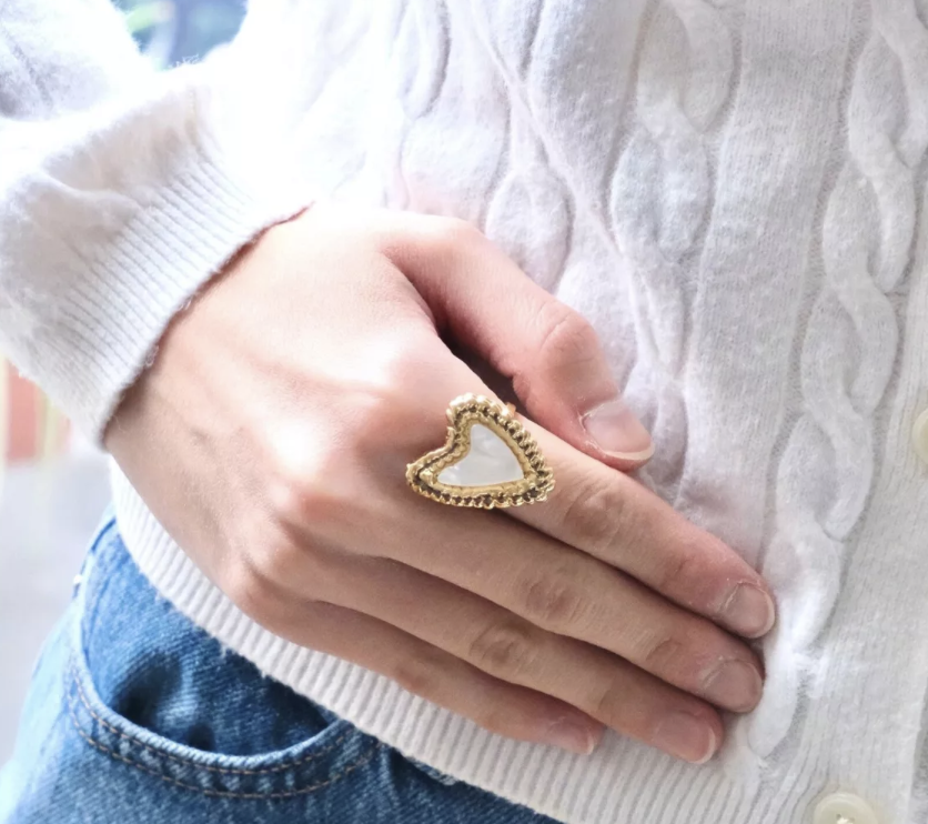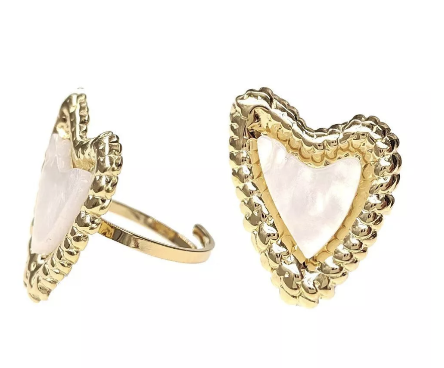 Une bague réglable taille unique dorée en forme de cœur en acier inoxydable. Le bijou est garanti sans nickel, sans cadmium, sans sel de plomb.