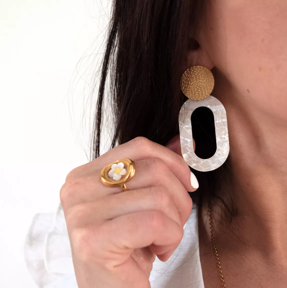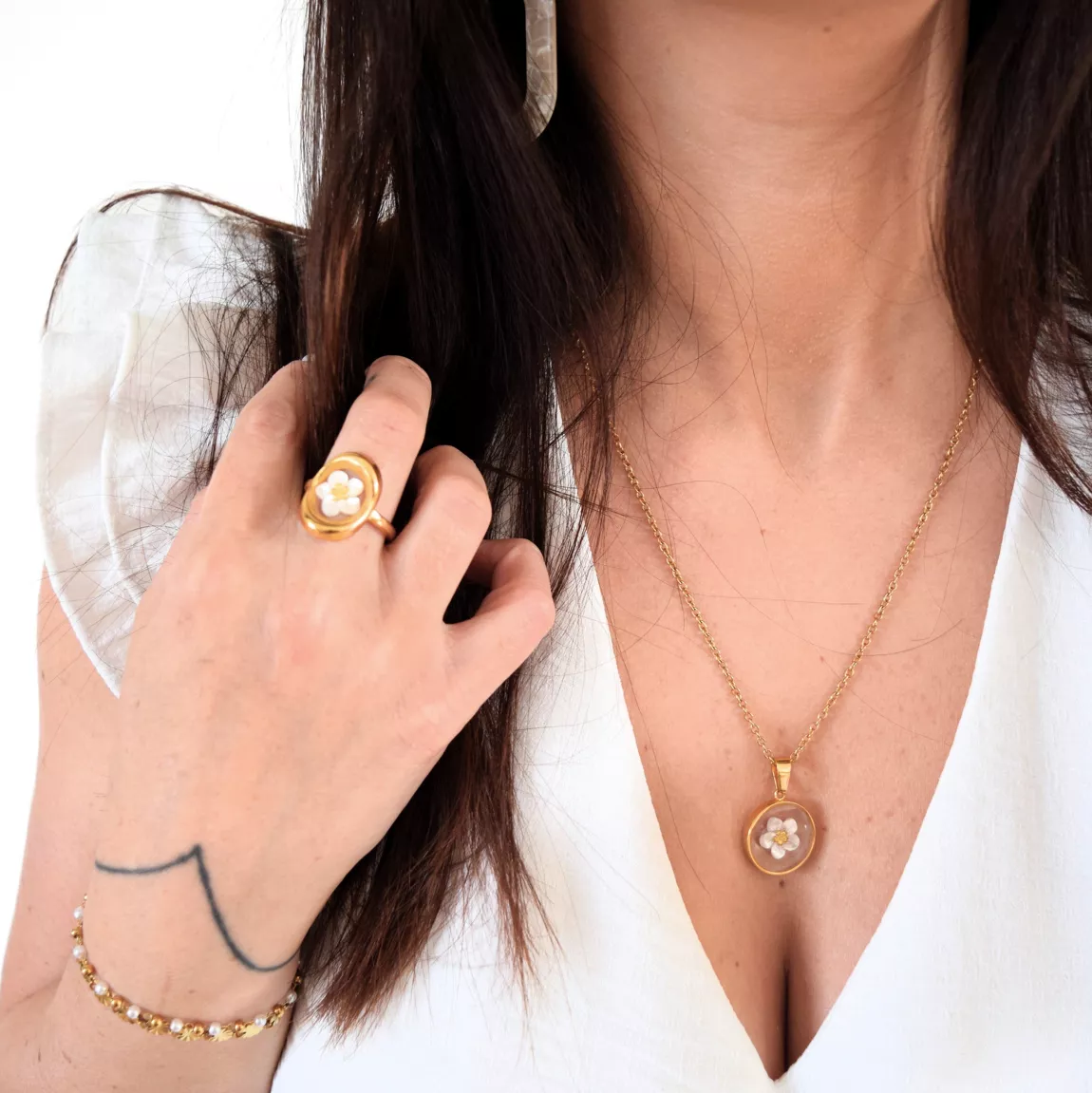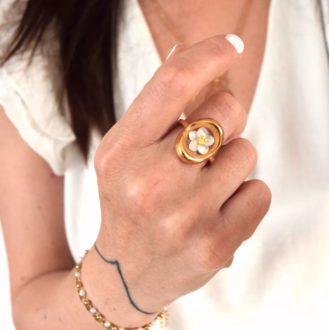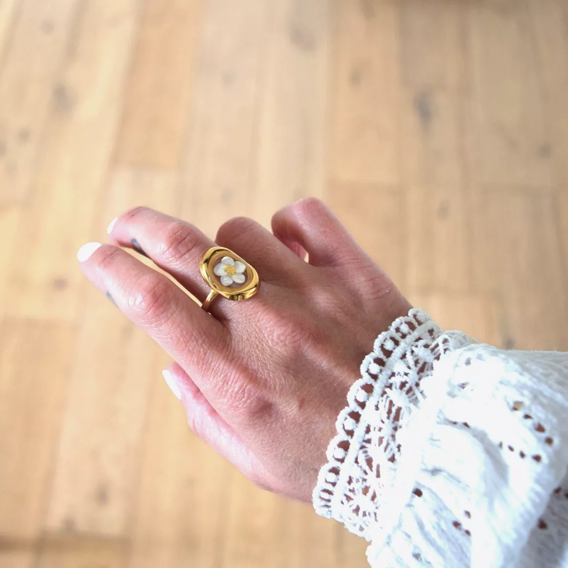 La bague est réalisée à la main avec de la résine UV et une petite fleur en nacre