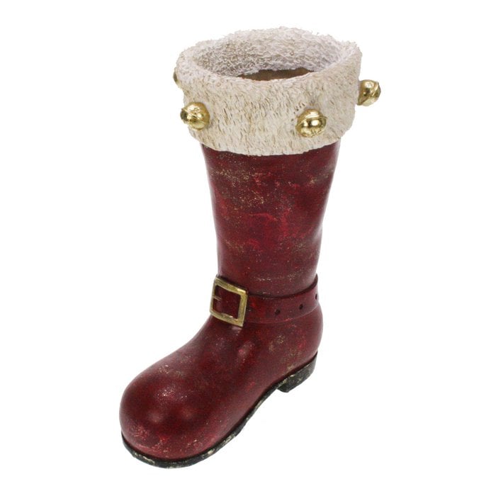 La botte en cuir rouge est ornée de clochettes dorées et d’un bord en fourrure douce, lui conférant un look festif et chaleureux.