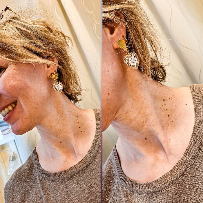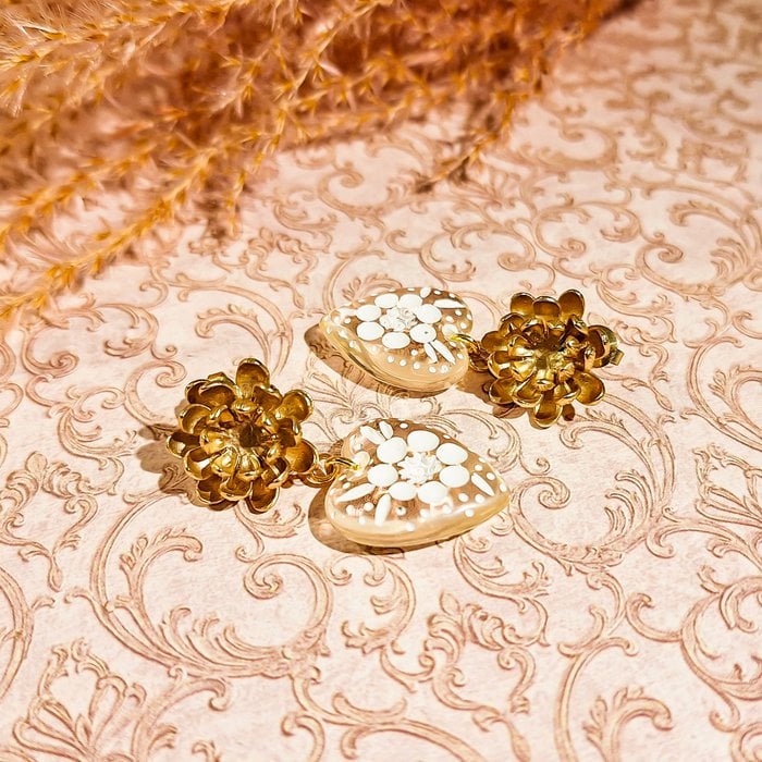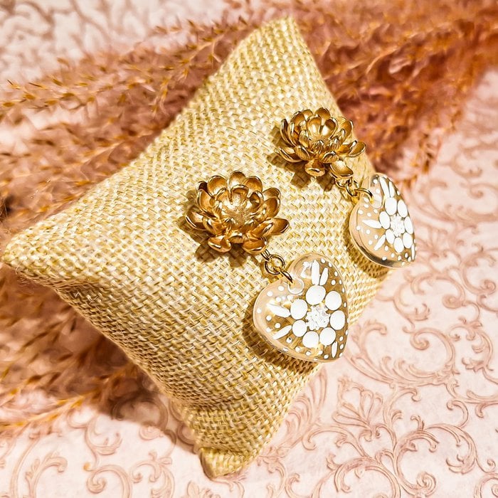 Boucles d’oreilles coeur & fleur tons dores blanc transparent