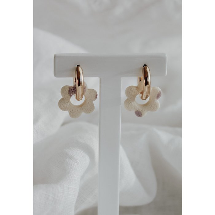 De superbes créoles dans un style bohème moderne et de magnifiques pendentifs fleuris et de superbes motifs en beige et lavande.