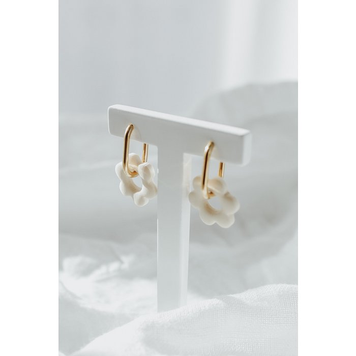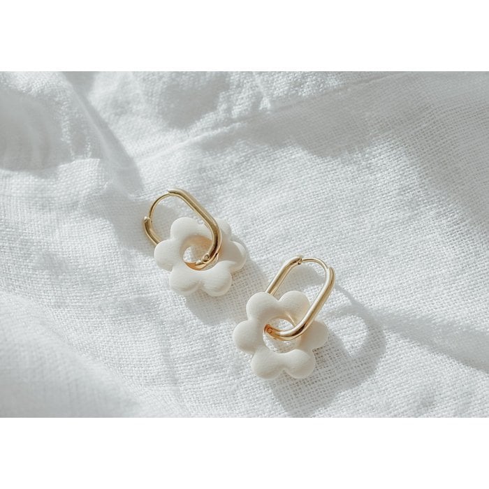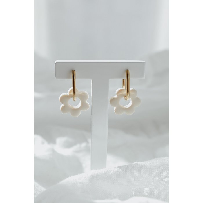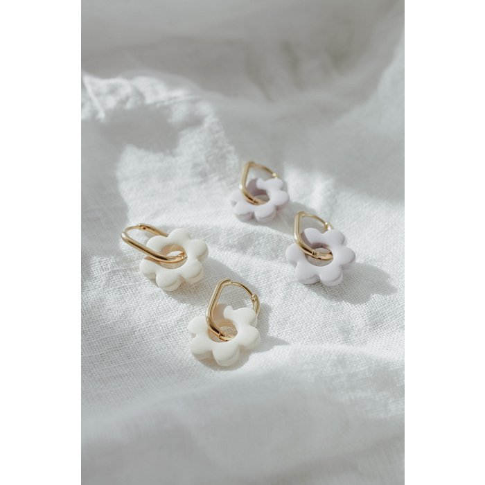 De superbes créoles dans un style bohème moderne et de magnifiques pendentifs fleurs de couleur beige.