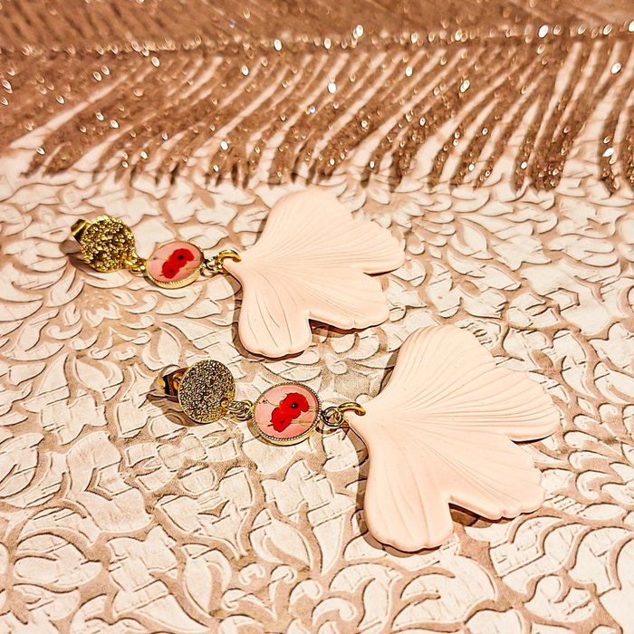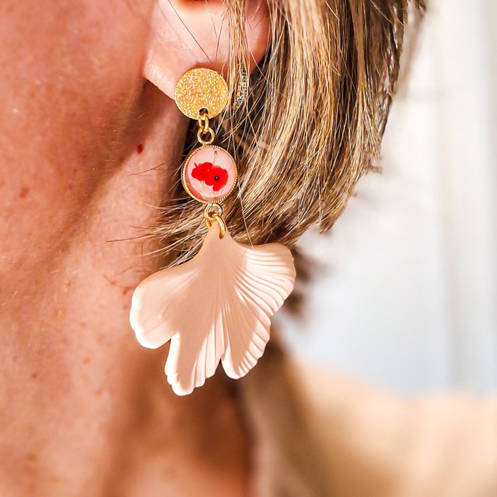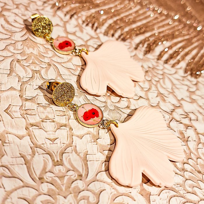 Boucles d’oreilles feuille de ginkgo motif coquelicot en résine & laiton doré 24K, fait main