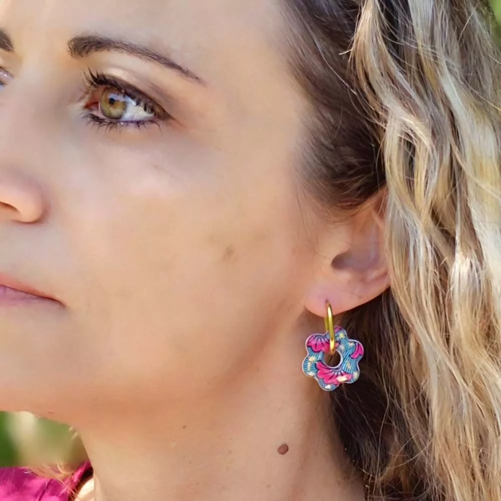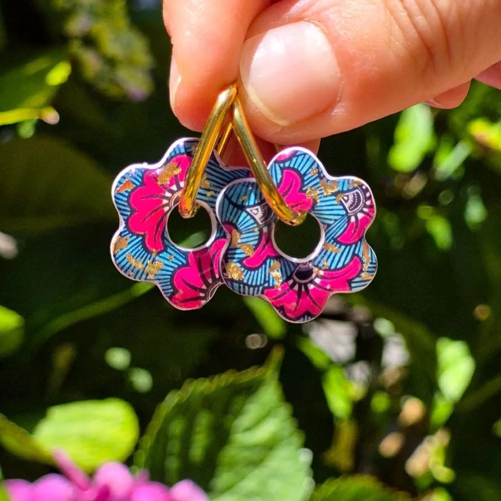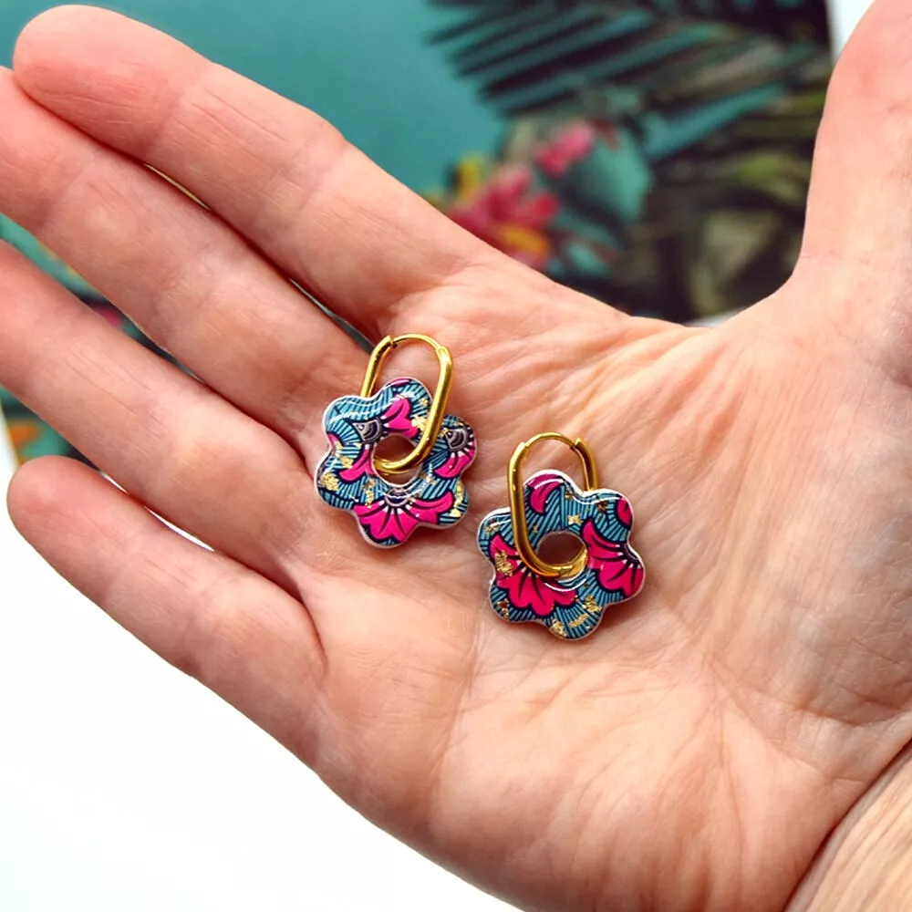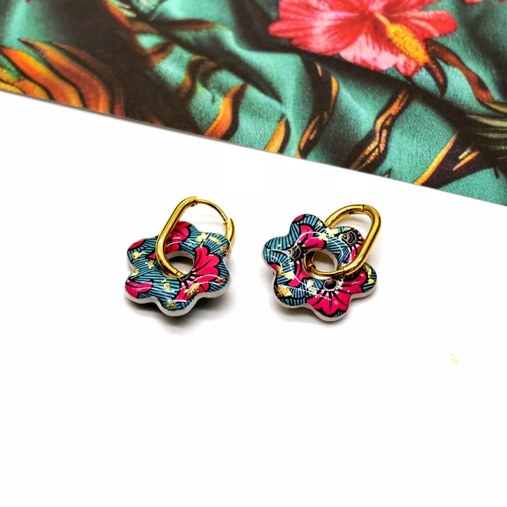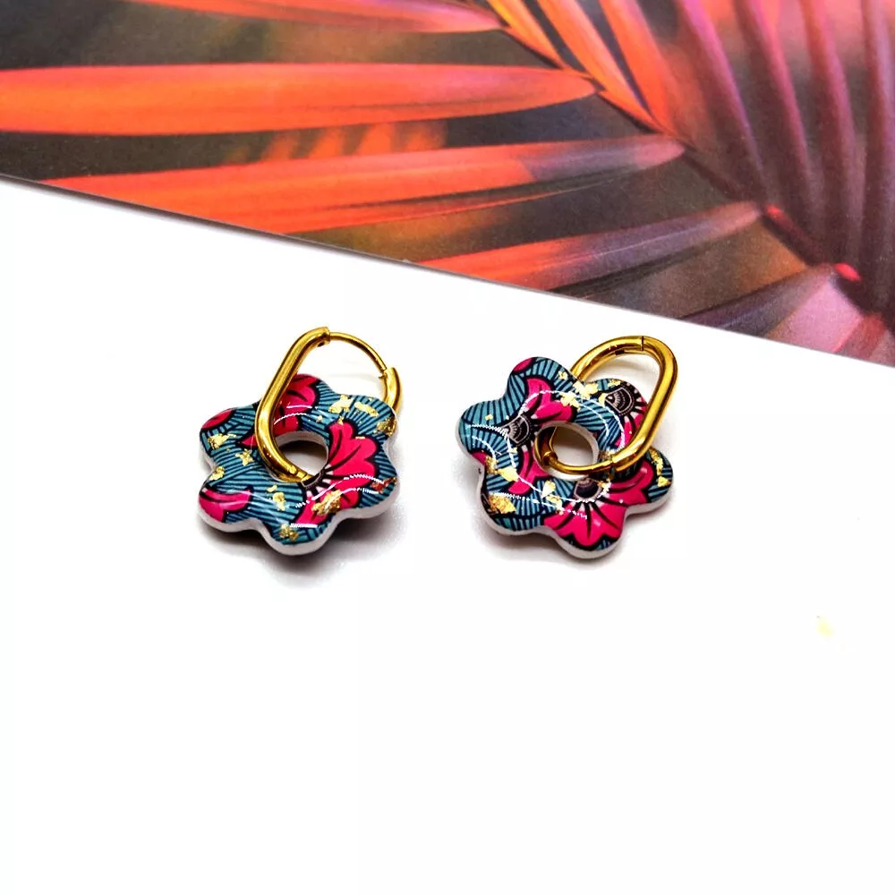 Ces boucles d’oreilles en forme de fleur sont conçues à partir de résine imprimée de motifs wax, incrustation feuilles dorées et montées sur de l’acier inoxydable doré, pour un rendu coloré, moderne et durable.