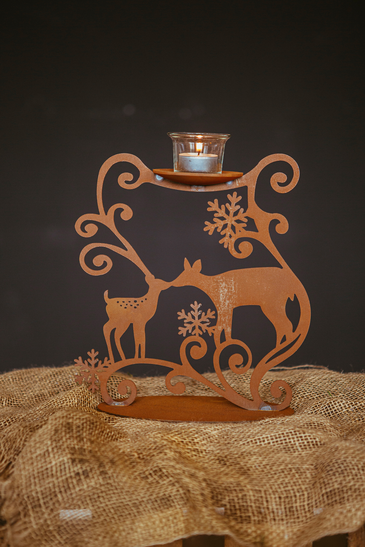 Bougeoir aux Biches en Métal Rouillé et Verre 24x26cm