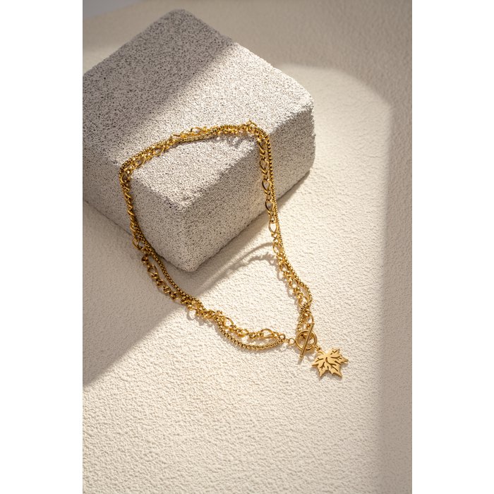 Collier Double Rang Dorée Feuille en Acier Inoxydable