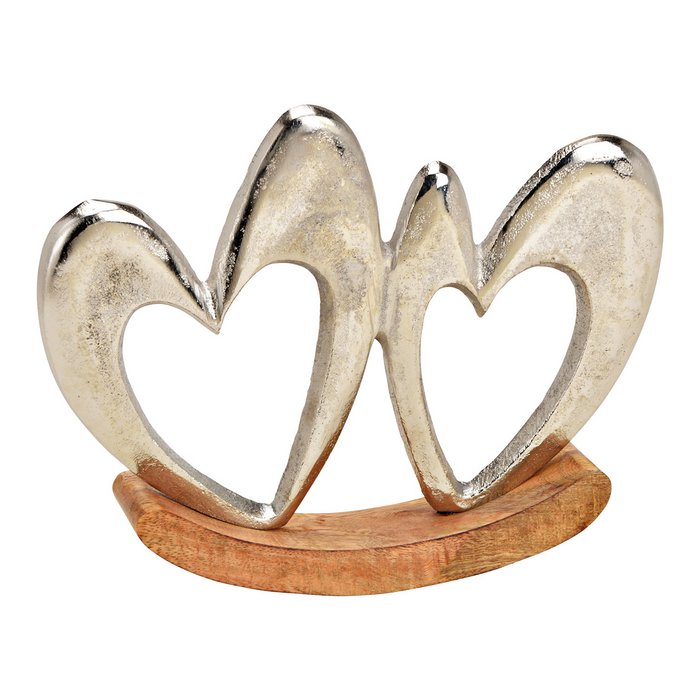 Double Coeurs en Métal Argenté sur Socle en Bois de Manguier 19x14x3cm