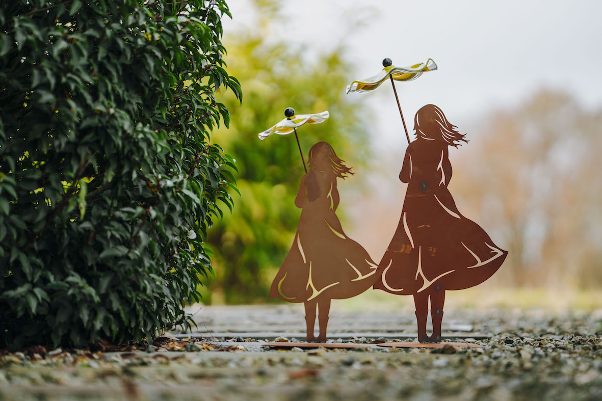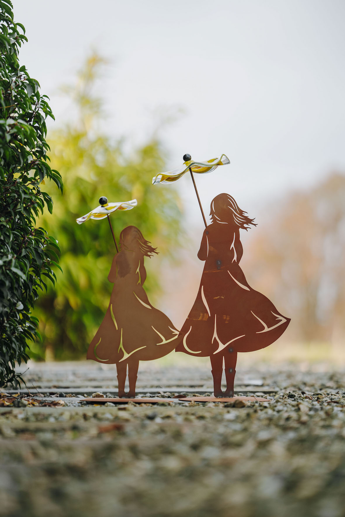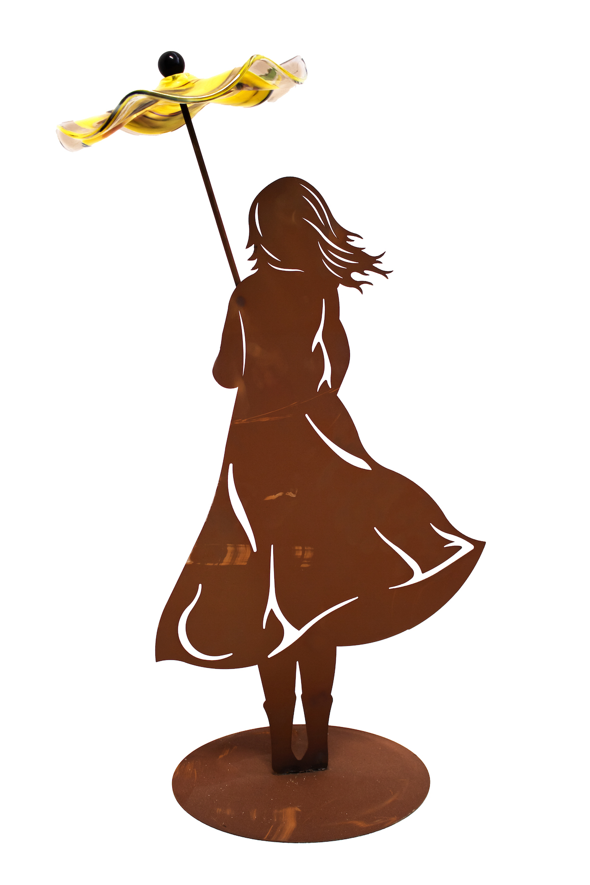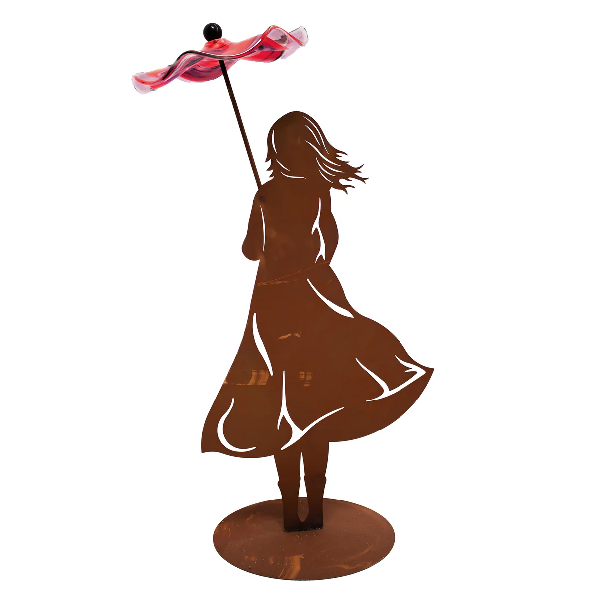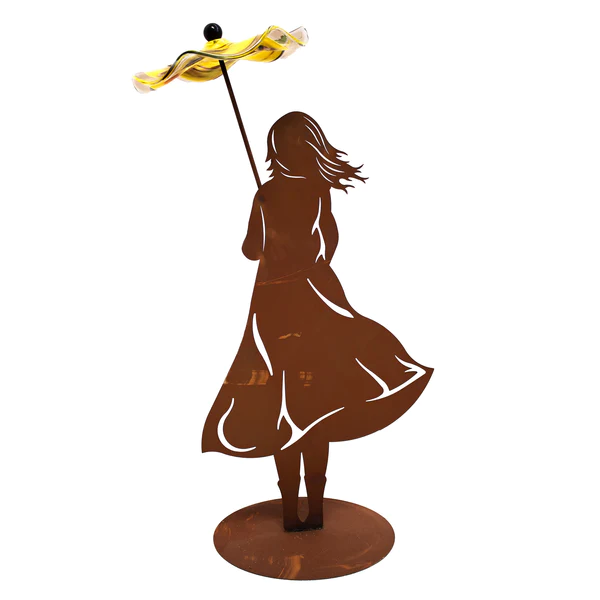 Fille sur Socle Ovale en Métal Rouillé, avec Parapluie en Verre ø22cm, Divers Coloris, 22xH.70cm