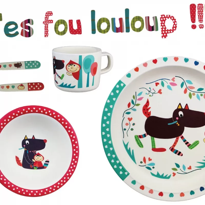 Coffret Vaisselle Mélamine 5 pièces (Bol, Assiette couverts, timbale) Collection Louloup.